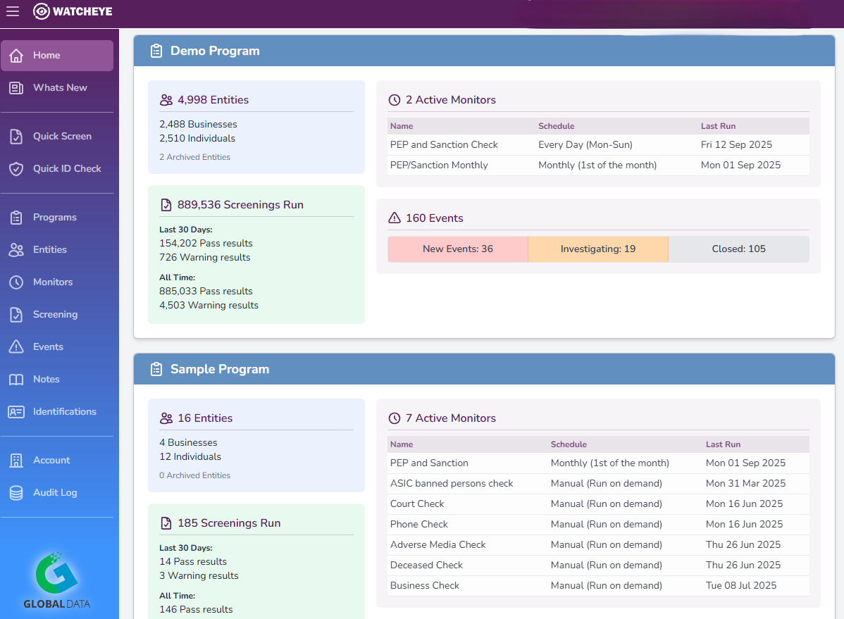 WatchEye offers one of the most comprehensive alert suites available. You can monitor and receive alerts for PEPs, sanctions, adverse media, criminal and civil court cases, bankruptcies, company liquidations, deceased data, address changes, phone and email connectivity changes, KYB updates, transactions, and more.