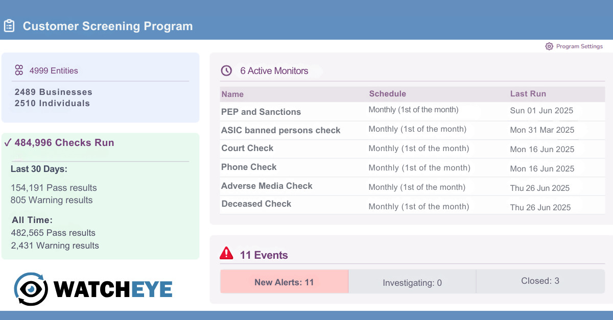 Screen against global AML/CTF, PEPs, and Sanctions watchlists.